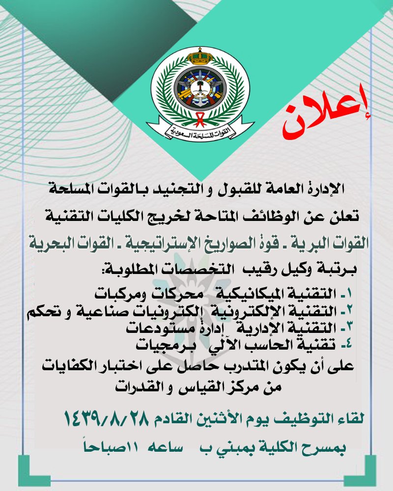 الكلية التقنية للبنين بحفر الباطن On Twitter عزيزي الخريج تعلن القوات المسلحة عن وظائف لخريجي الكليات التقنية وذلك يوم الاثنين الموافق 28 8 1439هـ بمسرح الكلية التقنية بحفر الباطن ساعة 11 صباحا بمبنى ب
